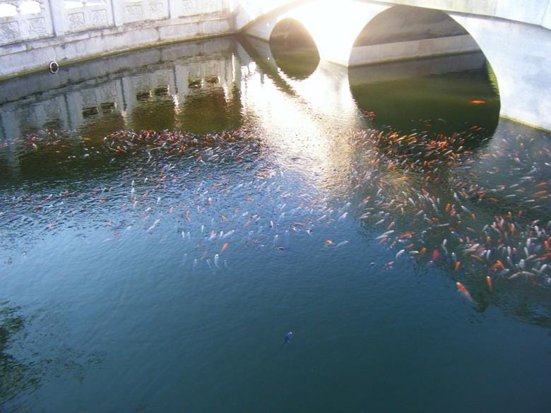 Like temples in Thailand, we can often see a pond where fish swim happily with out fear of being caught for food.