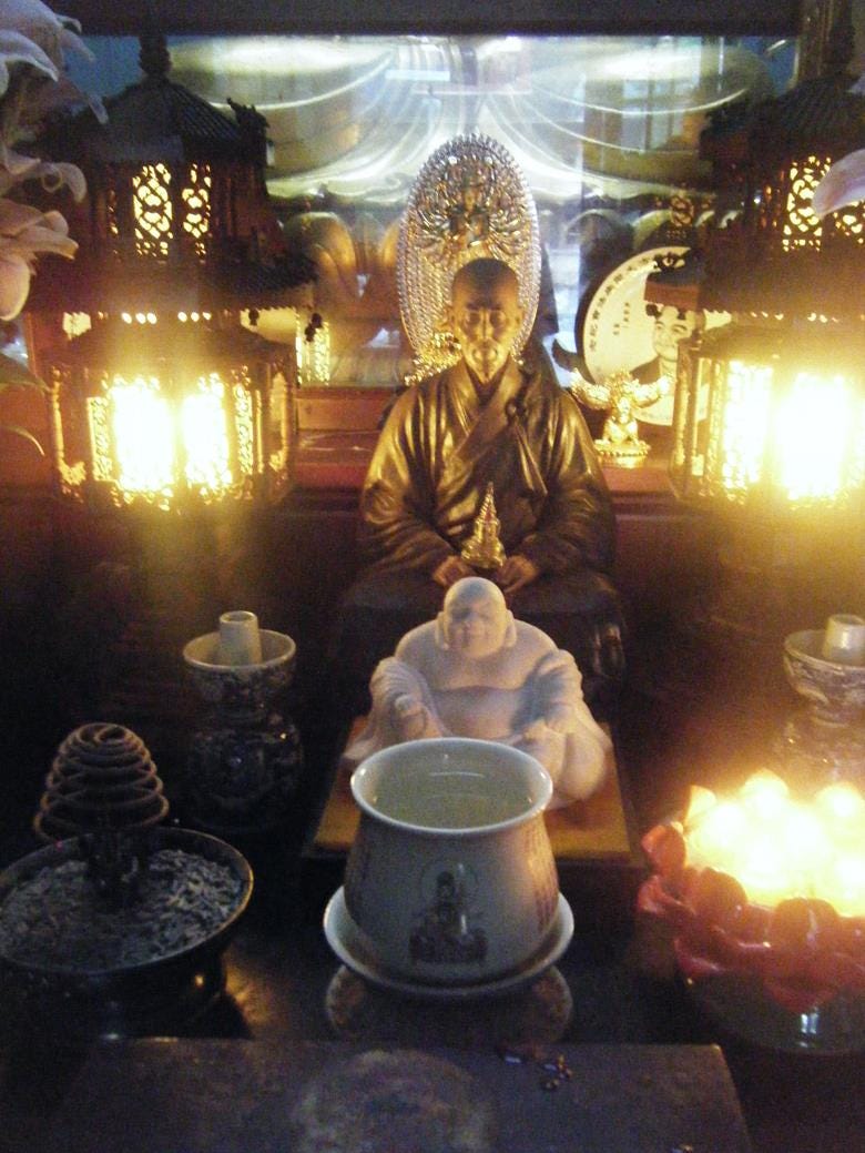 Here is a picture of the Baby Buddha, set up under the statue of the 1000 armed Kuan Yin.