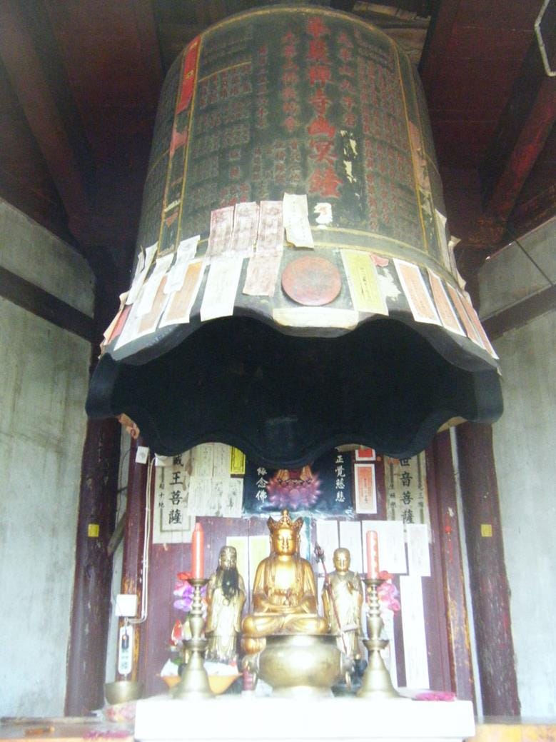 After climbing Jiu Hua Shan, Yan Hui took me to two other temples. This bell was placed at a temple with a sad history. During the Taiping Rebellion, 3000 people took refuge there, and were massacred. So the abbot of that temple brought the bell, to be rung in memory of the people killed, to help their ghosts rest in peace.