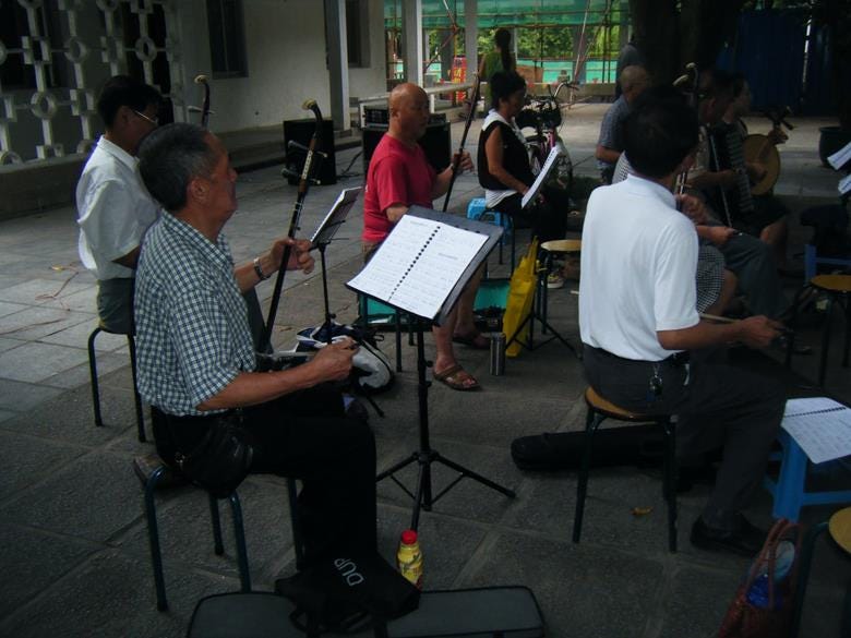 Here, in Zhong Shan park, one of several fine parks in Xiamen, a group of musicians play using traditional Chinese string and flute instruments.