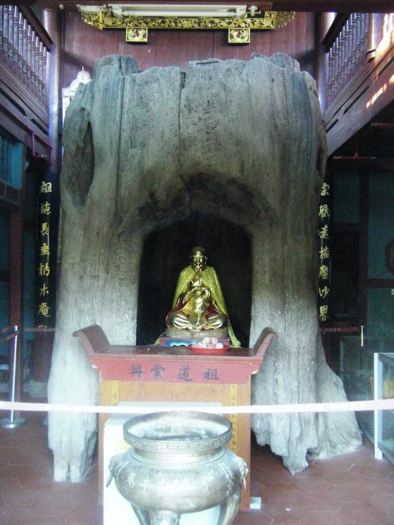 After Xue Feng had his insight, he left Jiangxi province, and went to Fujian. He took up sitting in this old semipetrified tree trunk. The building you see was built around it only recently. A statue of him sits inside.