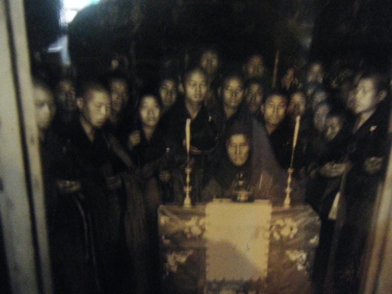 Here is a picture of the elderly Xu Yun, surrounded by his disciples. Including a young Jing Hui Lao Hesheng ("Jing Hui, the Old Monk [an honorific title]"). After the Communists took power, from about 1960-75, Jing Hui was imprisoned for 15 years, but on his release, followed Xu Yun's example and rebuilt many temples in China, including Lao Zu Si, Si Zu Si, Bailin Si, and Yu Quan Si, all of which I visited and or stayed at.