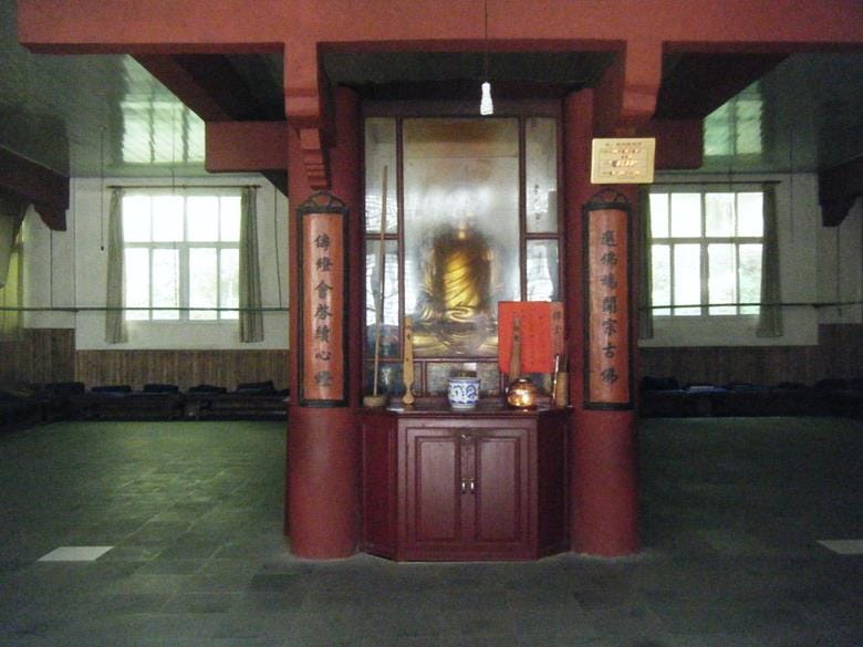 The meditation Hall at Baofeng Si. During Kinhin, walking meditation, the monks and laypeople circle the Buddha image in a fast, unstructured pace