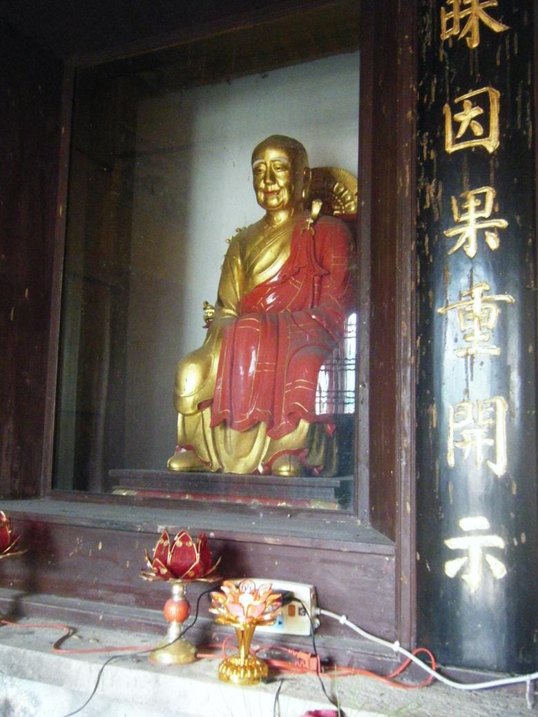 Following my stay at Tong Bo Yan Si, I went with some Chinese friends to the temple of Xue Feng, about a 4 hour drive from Xiamen, in western Fujian Province. I have special affinity because Xue Feng (822-908) practiced meditation diligently for 25 years. While traveling with his monk friend, Yan Tou, his brother monk finally blurted out to him, "Haven't you heard that, that what comes through the front gate is not the family treasure!" Haven't you heard that what comes in through the front gate (your senses) is not Your Family Treasure? Here is a statue of the old man himself.